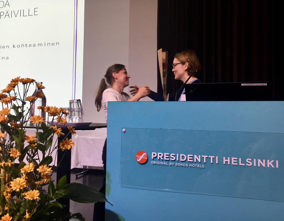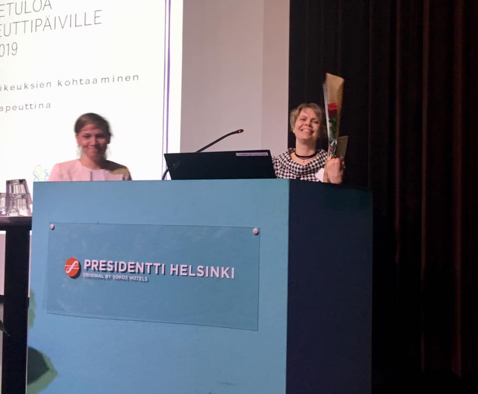 Elina Niemitalo-Haapola, Tiina Ihalainen ja Sinikka Hannus saivat Puheterapeuttipäivillä Puheterapeuttiliiton pronssisen ansiomerkin. Alla on kuvat Elinasta ja Tiinasta Puheterapeuttipäiviltä Helsingissä, missä he vastaanottivat ansiomerkkinsä.